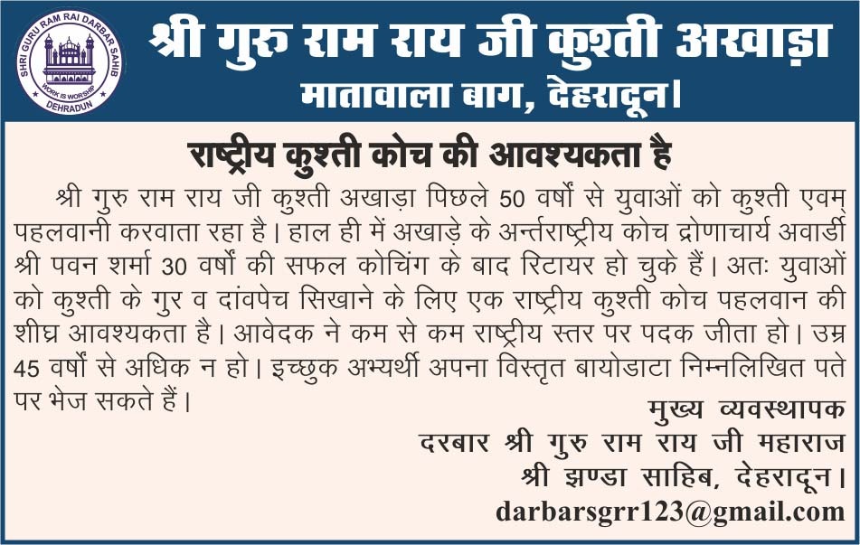 श्री दरबार साहिब प्रबन्धन समिति ने नए कुश्ती कोच जो युवाओं को अन्तर्राष्ट्रीय स्तर का खिलाड़ी बना सके और आलंपिक गोल्ड जीता सके, इसके लिए राष्ट्रीय स्तर के पहलवान कोच की खोज शुरू कर दी है। इस आश्य का विज्ञापन राष्ट्रीय स्तर के दैनिक समाचार पत्र में प्रकाशित कर दिया है। ताकि राष्ट्रीय स्तर के कुश्ती पहलवानों को श्रेष्ठ कोचिंग मिल सके और वे देहरादून उत्तराखण्ड का नाम अन्तर्राष्ट्रीय फलक पर चमका सकें।